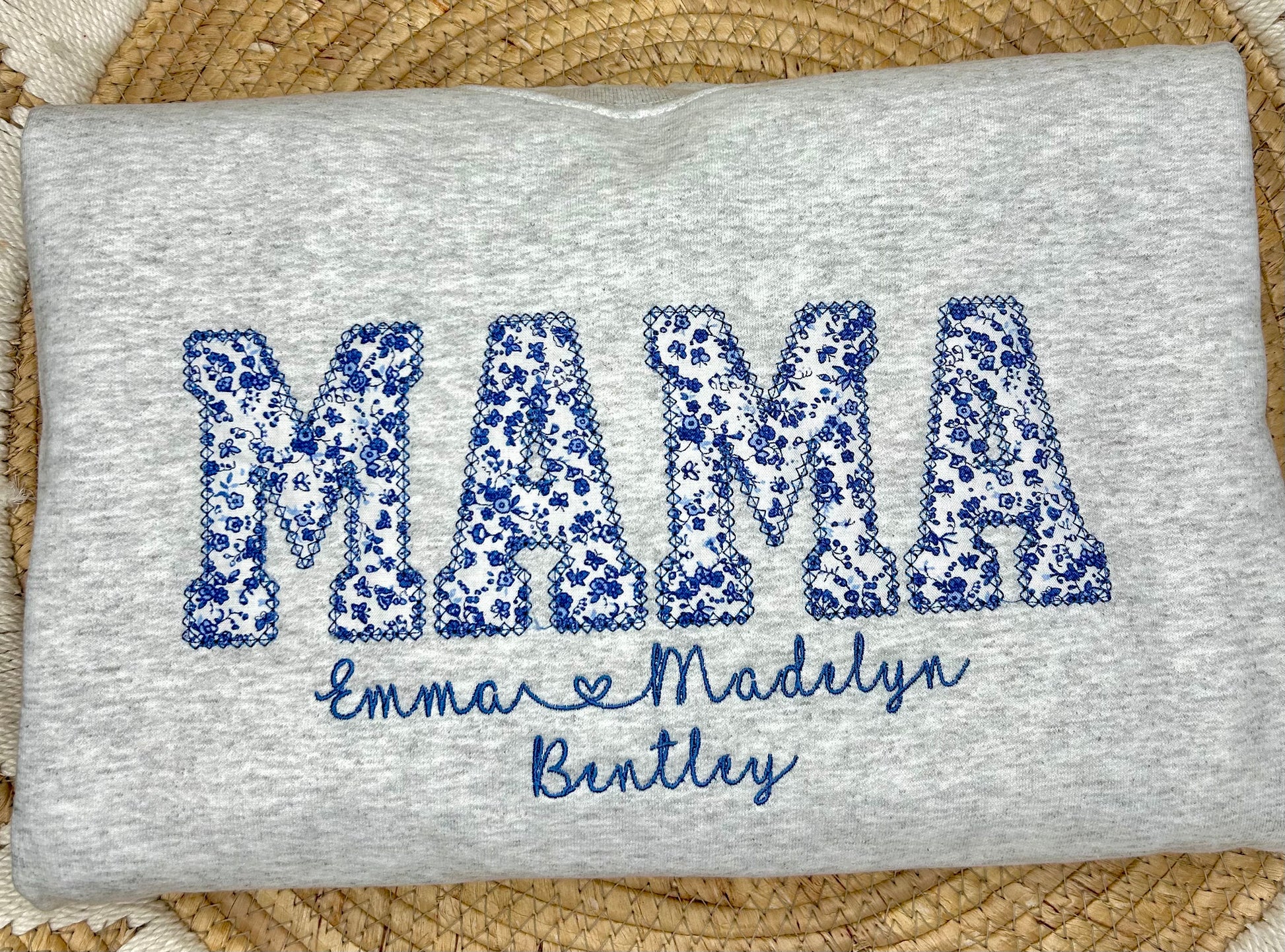Design a Mama Applique shirt! Pick your shirt style, pick your fabric, personalize with any name (MAMA, MIMI, NANA, ETC.) and add your children's names to the sleeve with a little heart or underneath as shown!